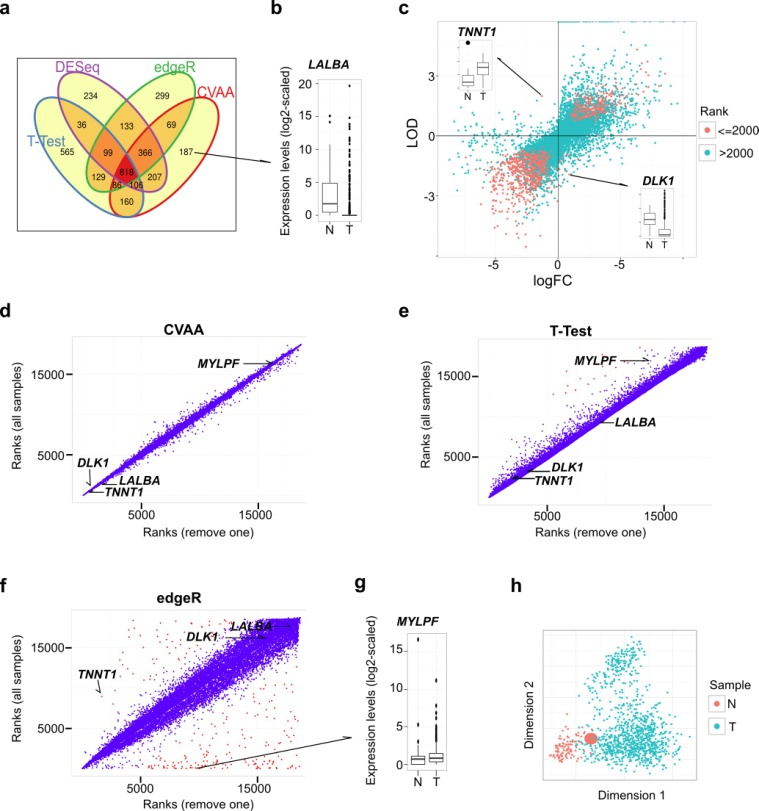 挖掘肿瘤大数据有助于识别和总结肿瘤发生、发展过程的分子变化规律。然而,肿瘤组织高度异质性、批次效应等因素是肿瘤数据分析的重要难题,而目前常用的转录组数据分析方法对于肿瘤离群值极度敏感,容易产生假阴性结果。针对此,中科院昆明动物所研究人员开发了一种新的不依赖均一化、非参的高维大数据分析算法(Cross-Value Association Analysis,CVAA)。基于对同一批转录组数据(1037个乳腺肿瘤和110个正常组织)的分析结果揭示:与T-Test、edgeR及DESeq等常用算法相比,CVAA在处理异质性数据时能明显地减少异常样本的影响和假阴性结果(图1)。