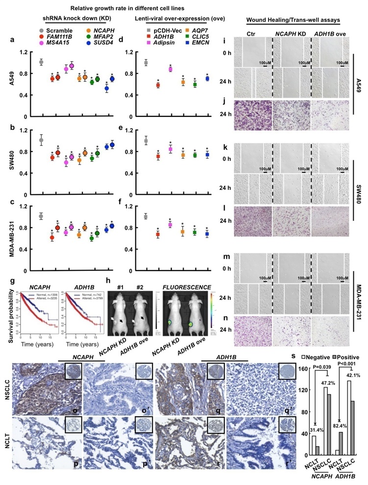 进一步将CVAA应用于TCGA数据库的5540个肿瘤(13种实体瘤)及正常组织的RNA-Seq转录组数据,研究人员成功鉴定到大量肿瘤显著差异表达基因,且不同肿瘤之间存在很多相似的基因转录紊乱模式。进而,针对新甄别得到的新的肿瘤相关基因和生物学途径,如酒精代谢途径(ADH1B基因)、补体途径(Adipsin)等。研究人员筛选了10个未被报道的基因进行了体内外功能验证研究,结果发现其表达量变化均能显著抑制肿瘤细胞的增殖和/或迁移,且部分基因(ADH1B和NCAPH)表达量改变显著影响病人生存率和体外移植瘤的生长(图2)。因此,该项工作不但成功鉴定出大量新的肿瘤相关基因和通路,为深入理解肿瘤发生发展提供研究靶标,同时也表明CVAA算法在大批量、异质性数据分析中具有重要的应用价值。该研究成果于近期发表在国际重要期刊Theranostics上(http://www.thno.org/v07p2888.htm),助理研究员李其刚、副研究员何永捍、博士生吴焕和副研究员杨翠萍为共同第一作者,孔庆鹏研究员和陈勇彬研究员为共同通讯作者。该项目得到中国科学院、国家自然科学基金、云南应用基础研究和中国科学院青年创新促进会等项目的支持。